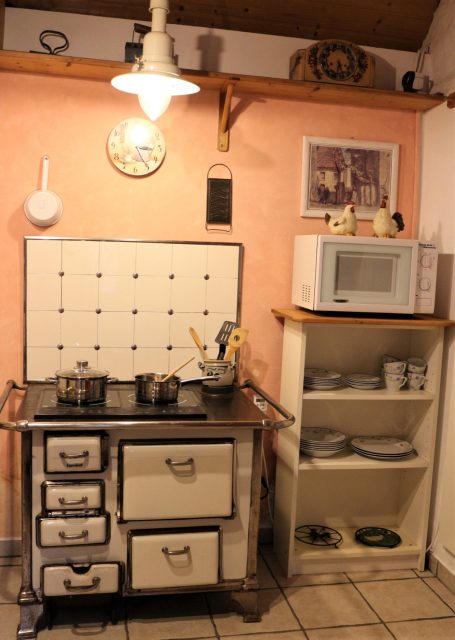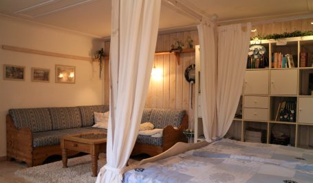 Die ROMANTIK ist unsere "Kleine" , hier können Sie Wohnen und Schlafen in einem romantischen Zimmer mit Himmelbett und es gibt einen gemütliche Essbereich mit sichtbarem Feuer im Pelettofen.