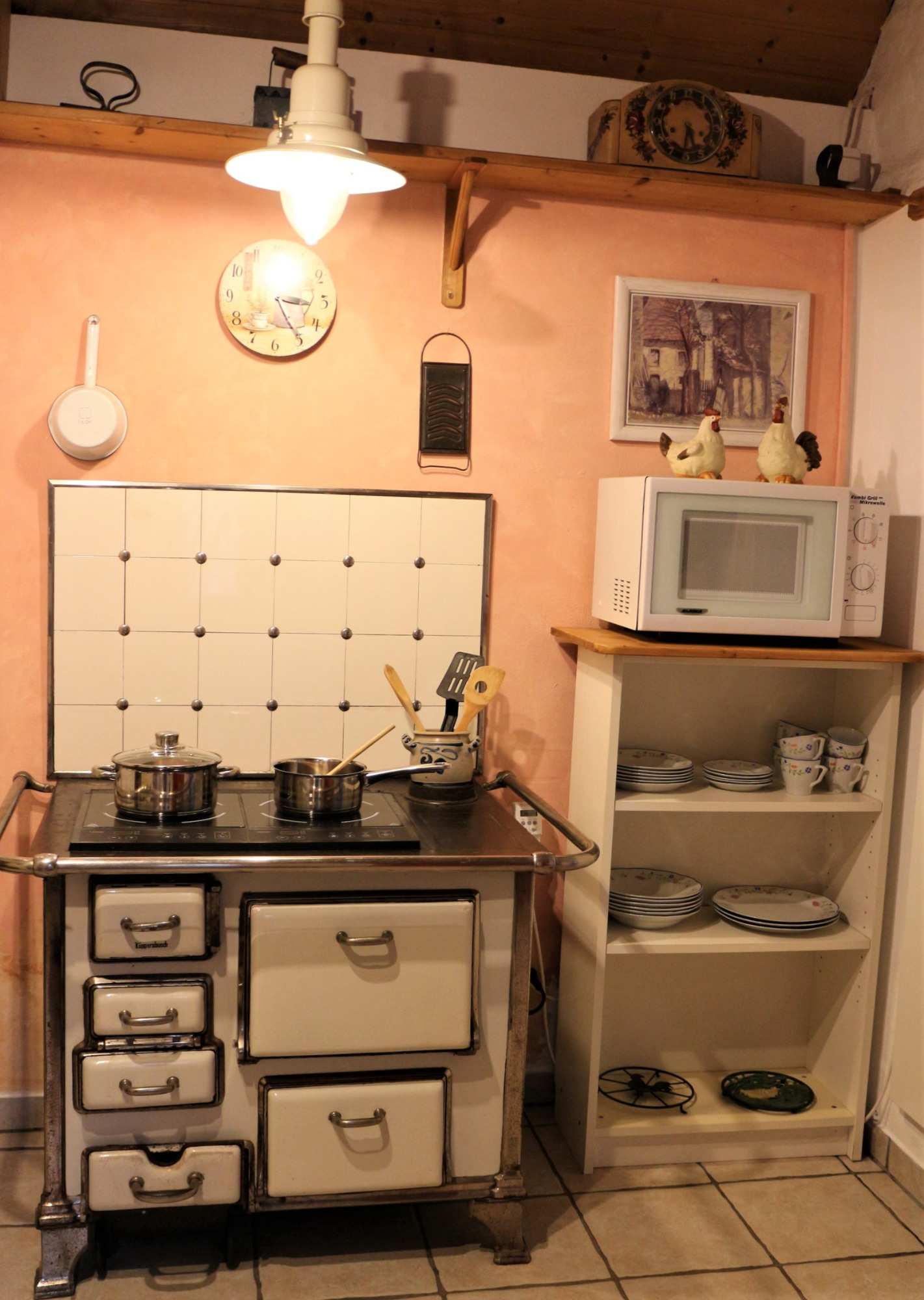 - kleine Küche mit Herd, Mikrowelle und Minibackofen
