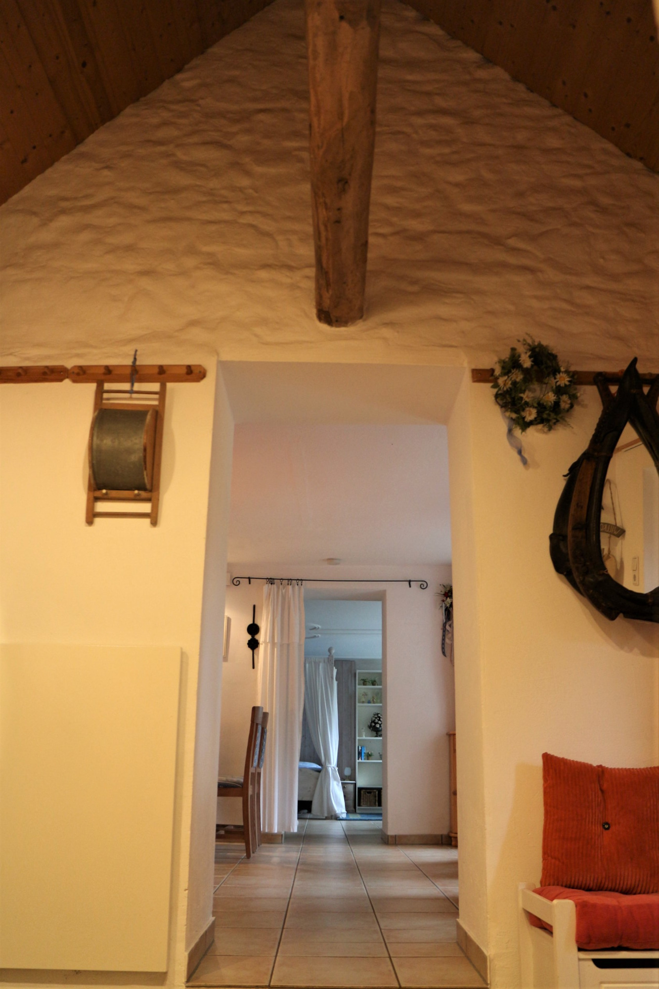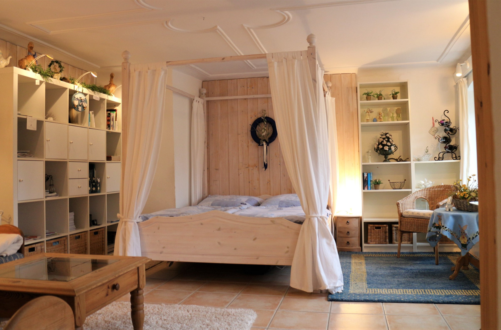 Die ROMANTIK ist unsere "Kleine" , hier können Sie Wohnen und Schlafen in einem romantischen Zimmer mit Himmelbett und es gibt einen gemütliche Essbereich mit sichtbarem Feuer im Pelettofen.